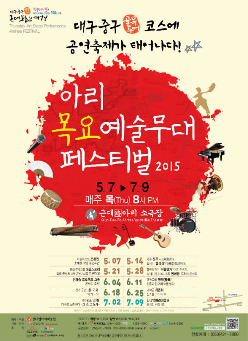 아리 목요예술무대 페스티벌 2015인 이번 축제는 5월 7일 마임이스트 조성진부터 시작해 7월 9일 김나영 아리예술단 공연으로 끝을 맺는다.