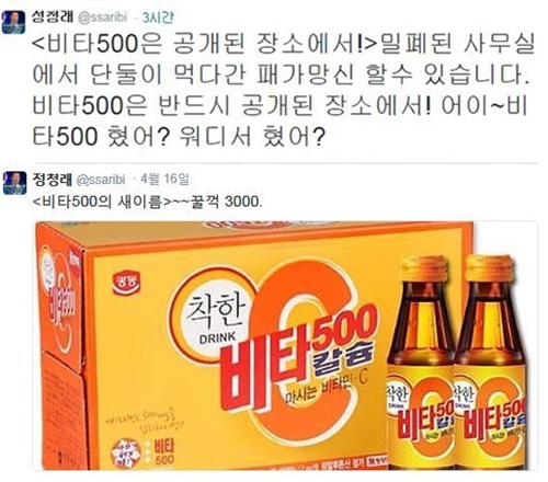 정청래 의원은 17일 자신의 트위터에 “비타500은 공개된 장소에서! 밀폐된 사무실에서 단둘이 먹다간 패가망신 할 수 있습니다. 어이~ 비타500 혔어? 어디서 혔어?”라는 글을 올렸다.