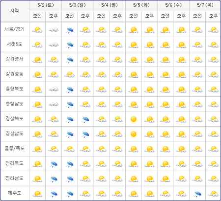 기상청은 근로자의 날부터 어린이날까지 황금연휴인 1~5일 닷새동안 전국이 흐리고 비가 오나 4일부터 개면서 5일 어린이날은 화창, 초여름 날씨가 될 것이라고 예고했다.