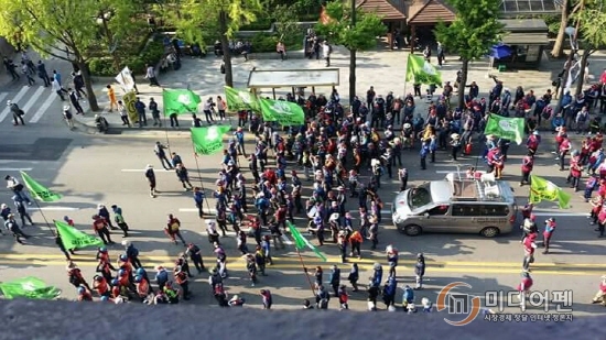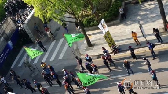 [미디어펜=이서영 기자]노동절을 맞은 1일 민주노총과 세월호 유가족들이 집회시위를 벌이던 중 신고된 행진로를 이탈해 청와대 방향으로 집단 진출을 시도한 일이 벌어졌다.