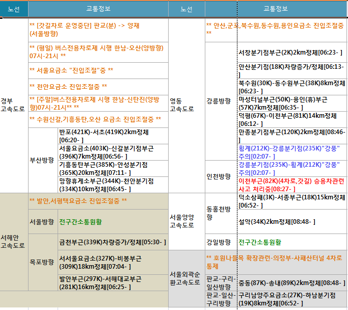 | 한국도로공사는 2일(토) 오전 중 경부선과 영동선, 호남선의 수도권역 주요 병목의 정체가 오전 내내 지속될 것으로 내다봤다. | ||