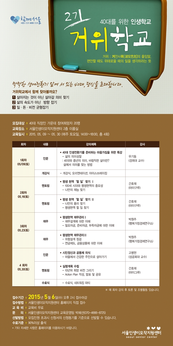 서울시, 6일까지 40대 위한 맞춤형 인생학교 입학생 모집