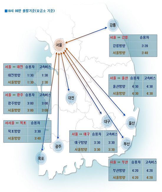 도로공사는 오는 오전 10시 기준으로 서울~부산간 승용차 소요시간이 양방향 4시간 20분, 서서울~목포간 3시간 30분 내외, 서울~강릉 양방향이 2시간 30분 내외로 '원활'하다고 밝혔다.