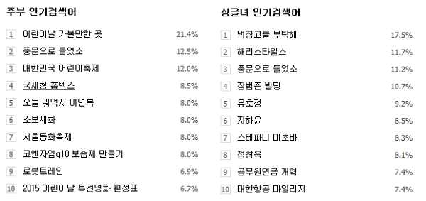 이날 어린이날 주부의 인기검색어에서 주목을 끈 키워드의 하나는 ‘국세청 홈텍스’다. 검색어 순위 4위를 차지한 ‘국세청 홈텍스’는 근로자와 다자녀 등에 대해 추가 소득공제를 담은 소득세법 개정안이 국회 본회의에서 통과되는 데 따른다. 가정 ‘내무부 장관’으로서의 주부가 주목할만한 관심사였다.