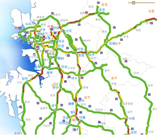 연합뉴스 보도에 따르면, 현재 경부고속도로 서울 방향 회덕분기점∼신탄진나들목, 남이분기점∼청주나들목, 입장휴게소∼안성분기점, 달래내 고개∼서초나들목 등에서 차량 속도가 시속 20∼30㎞에 그친다고 한다.
