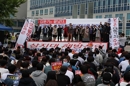| ▲ 11일 강원 원주시 상지대학교 대학원관 앞에서 학생 및 교수 등이 상지학원 임시이사 파견 및 열린 김문기 총장 해임 등을 촉구하는 궐기대회에 참여하고 있다. /사진=상지대 비상대책위원회 | ||