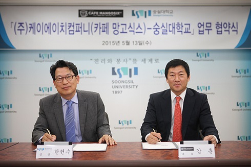 [미디어펜=류용환 기자] 숭실대학교는 카페 ‘망고식스’ 운영업체 케이에이치컴퍼니와 ‘커피바리스타 교육과정 개설·운영 협약(MOU)을 13일 체결했다고 14일 밝혔다.