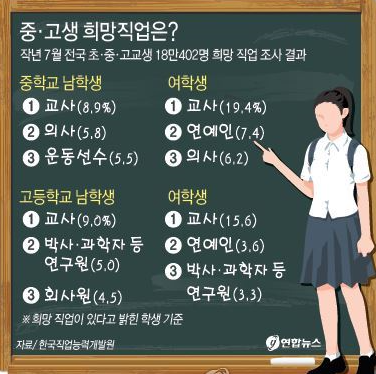 | ▲ 한국직업능력개발원이 전국 초 중 고교 학생 18만명을 대상으로 장래 희망 직업을 조사한 결과, '선생님과 같은 교사'를 꼽았다. | ||