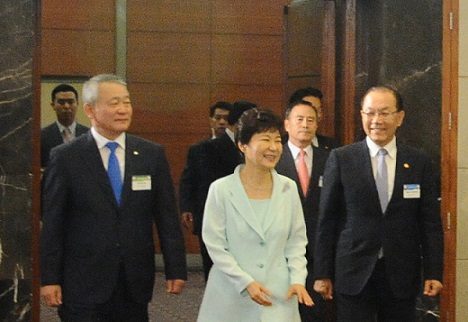 | ▲ 15일 서울 양재동 The-K호텔서울에서 열린 '제34회 스승의 날' 기념식에서 박근혜 대통령(가운데)과 황우여 사회부총리 겸 교육부장관(오른쪽), 안양옥 한국교원단체총연합회 회장이 행사장에 들어서고 있다. /사진=한국교총 | ||