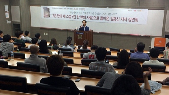| ▲ 26일 서울 중구 동국대에서 진행된 '명사특강'에서 김홍신 전 국회의원이 강연을 진행하고 있다. | ||