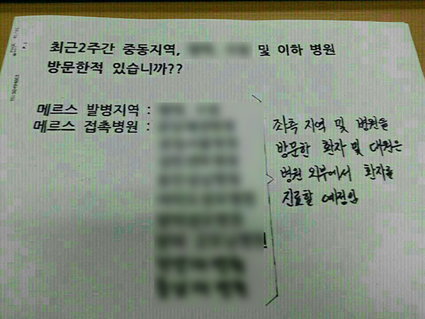 2일 SNS를 통해 돌고있는 '최근 2주간 중동지역, ○○, ○○ 및 이하 병원 방문한 적 있습니까?'라는 질문과 함께 메르스 발병 지역 2곳과 함께 메르스 접촉 병원 7곳의 명단이 나열돼 있는 문서의 사진이 시민들의 공포를 더하고 있다.