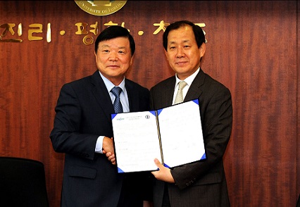 | ▲ 10일 서울 동대문구 한국외국어대학교에서 진행된 '교류협력 협약식'에서 김철준 한독 사장(왼쪽)과 김인철 한국외대 총장이 기념사진을 촬영하고 있다. | ||