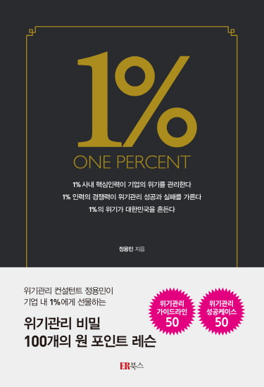 책 '1% ONE PERCENT'는 기업 핵심 인력 1%를 지칭하는 의미로 붙여진 제목이다. 국내 대기업과 중견기업들의 전체 직원 수 기준 핵심 임원의 비율은 1% 내외. 중소기업의 경우에도 실제 회사에 위기가 발생했을 때 이를 관리하는 핵심 인력은 1% 안팎이다. '1% ONE PERCENT'는 이 핵심 인력 1%에게 "평소에 관심을 가지고 조직과 자신의 위기관리 경쟁력을 키우라"고 강하게 조언한다.
