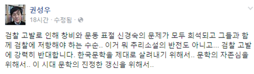 권성우 문학평론가는 "한국문학을 제대로 살려내기 위해 문학의 자존심을 위해 이 시대 문학의 갱신을 위해 검찰 고발에 강력히 반대한다"고 페이스북을 통해 주장했다.