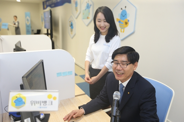 | ▲ 이광구 우리은행장(사진 오른쪽)이 인터넷 전문은행 시범모델로 설립한 ‘위비뱅크 출범식’에서 대출고객과 상담을 하고 있다./우리은행 | ||
