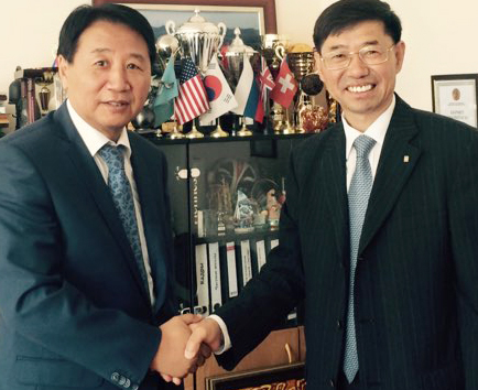 | ▲ 6일 카자흐스탄 DOSTAR고등학교에서 레오니드 킴 교장(왼쪽)과 구기헌 상명대 총장이 기념사진을 촬영하고 있다. | ||