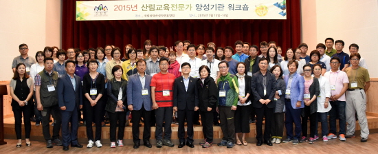 ▲ 신원섭 산림청장이 13일 충북 청주시 국립상당산성자연휴양림에서 열린 '2015년 산림교육전문가 양성기관 워크숍'에 참석, 기념 촬영을 하고 있다./사진=산림청 제공