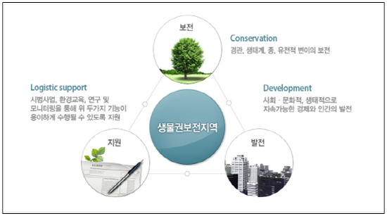 | ▲ 생물권보전지역은 국제적 협약이나 협정의 적용을 받지 않으나 다음의 세 가지 기능을 적절히 수행하는데 필요한 기준들을 만족시켜야 한다./자료=산림청 | ||