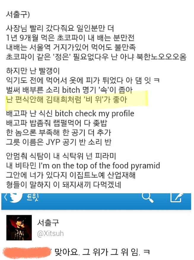 과거 래퍼 서출구는 자극적인 노래 가사로 논란이 되었다. 특히 가사 중 “난 편식 안해 김태희처럼 ‘비 위’가 좋아”라고 표현해 김태희를 비롯한 여성을 비하하는 노래 가사로 비난을 받았다.
