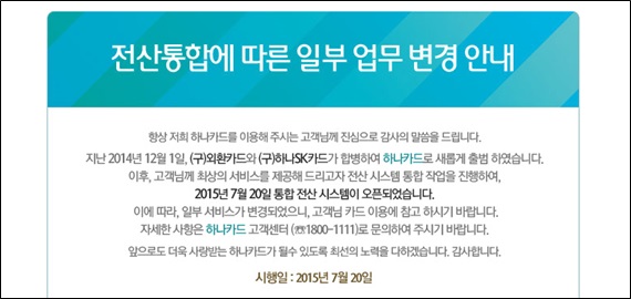하나카드는 20일 외환카드와 하나SK의 합병으로 탄생한 하나카드의 통합 전산 시스템을 오픈했고 앞서 문자 등을 통해 이날 0시부터 오전 5시까지 신용·체크카드 결제가 일부 중단된다고 고객들에게 알렸다.