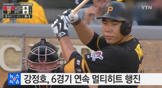 | ▲ 메이저리그로 진출한 피츠버그 파이어리츠의 강정호 선수가 25일 PNC파크에서 열린 워싱턴 내셔널스와의 홈경기에서 6경기 연속 멀티히트를 기록했다.YTN 뉴스화면 캡처. | ||