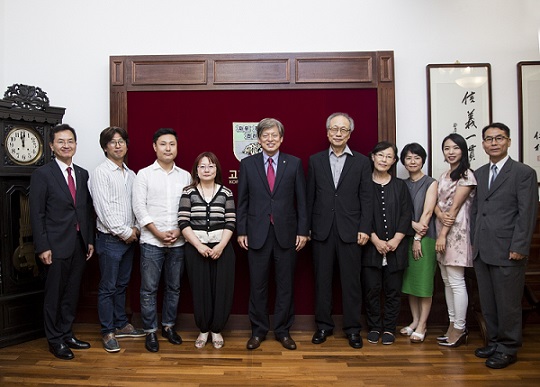 | ▲ 28일 서울 성북구 고려대에서 진행된 '개교 110주년 특별전 작품 기증식'에서 대학 관계자 및 예술작가 등이 기념사진을 촬영하고 있다. |