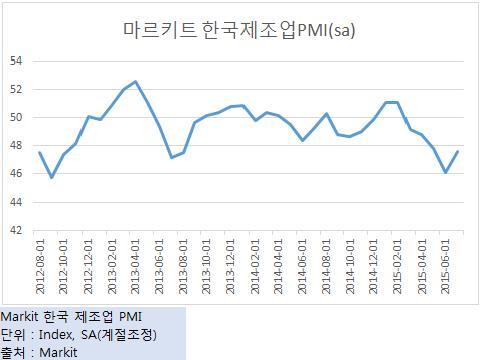 5일 금융정보 제공업체 마르키트에 따르면 한국의 7월 제조업 구매관리자지수(PMI)는 47.6으로 지난 2013년 8월 기록인 47.5 이후 두번째로 낮은 수치다.