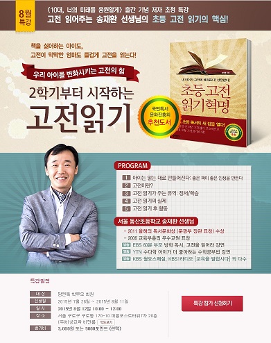 서울 구로구 비상교육 대강당에서 진행되는 이번 특강에서는 문화체육관광부 ‘2011 올해의 독서문화상’ 수상자이자 ’초등 고전 읽기 혁명’ 저자인 송재환 서울 동산초등학교 교사가 강연에 나설 예정이다.