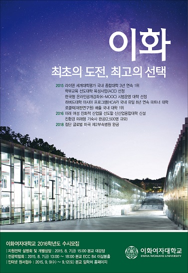 [미디어펜=류용환 기자] 이화여자대학교는 서울 서대문구 교내 대강당 및 ECC 이삼봉홀에서 ‘2016학년도 수시 지원전략 설명회’와 ‘전공박람회’를 7일 개최한다.