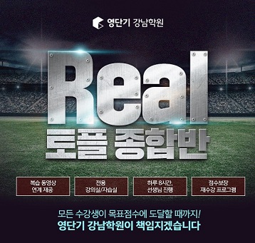 영단기 강남학원 토플 리얼 종합반은 교환 학생이나 해외 대학원 진학, 유학 준비 등 단기간 토플 고득점을 목표로 하는 학생들을 위해 마련된 집중 관리 강좌다.