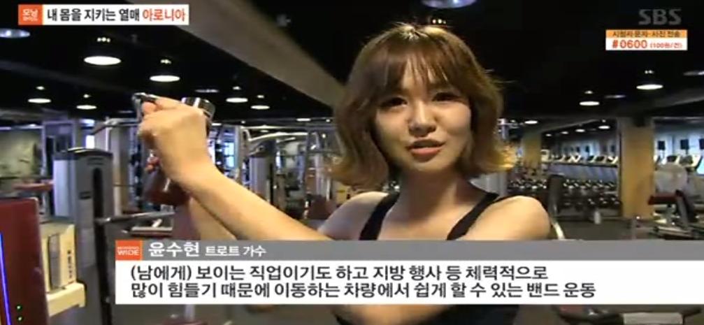 이날 윤수현은 전신이 붙는 트레이닝 레깅스와 탑을 착용, 밴드를 이용한 운동을 직접 시범 보이며 흠잡을 곳 없는 훌륭한 몸매를 뽐냈다. 또 운동하는 내내 아로니아 분말을 물에 타 먹으며 아로니아 매니아임을 증명했다.