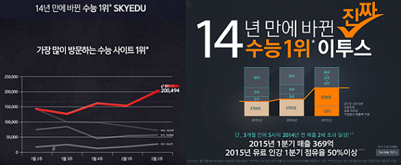 | ▲ 인터넷강의 분야 1위를 놓고 공방을 벌이고 있는 스카이에듀의 광고 그래프(왼쪽)와 이투스교육의 광고. | ||