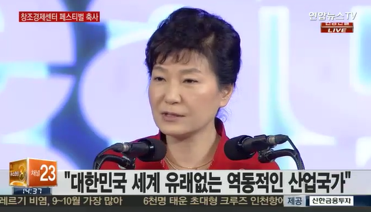| ▲ 박근혜 대통령은 27일 오후 대전 카이스트에서 열린 '창조경제혁신센터 페스티벌' 개막식에 참석해 “난관을 극복하고 침체의 늪에서 빠져나오기 위해서는 창조경제에서 그 해답을 찾아야 한다”면서 “21세기 국가경제의 성장 엔진은 바로 창조경제 뿐”이라고 강조했다./사진=연합뉴스TV 캡처 | ||