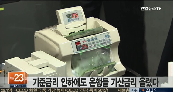 ▲ 기준금리가 떨어졌음에도 불구하고 은행들이 주택담보대출의 가산금리 비중을 늘린 것으로 드러났다.연합뉴스TV 뉴스화면 캡처.