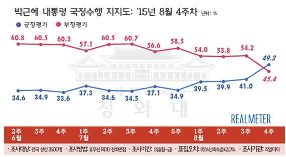 | ▲ 31일 여론조사 전문기관인 리얼미터에 따르면 박근혜 대통령의 국정 지지도는 지난 주보다 8.2%포인트 오른 49.2%를 기록했다. 이는 8‧25 남북 합의 타결에 힘입은 것으로 분석된다./사진=리얼미터 홈페이지 | ||