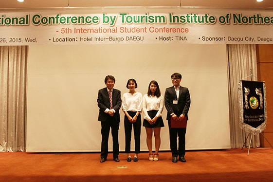 | ▲ 지난달 26일 대구 인터불고호텔에서 진행된 동북아관광학회 주관 ‘제5회 국제대학생 발표대회' 시상식에서 (왼쪽부터)이응진 학회장, 대구대 박다희 정혜진, 김대원 학생이 기념사진을 촬영하고 있다. | ||