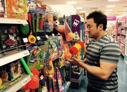 사진 속 마동석은 백화점 장난감 코너에서 뿅망치를 고르고 있는 모습이다. 우락부락한 몸과는 달리 귀여운 장난감을 들고 있는 모습에서 웃음을 자아냈다.