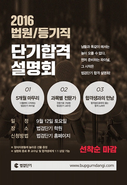 박형준 법검단기 실장은 “2016년 법원/등기직 시험 합격을 위해서는 남은 5개월 간의 파이널 준비가 무엇보다도 중요하기에 법검단기는 수험생들을 위해 시험 대비 파이널 과정을 내달부터 오픈한다. 특히 이번 설명회에는 실제 합격생들의 생생한 합격 후기와 더불어 법검단기만의 단기 합격 노하우를 공개할 계획이니 수험생들의 많은 참여와 관심 바란다”고 말했다.