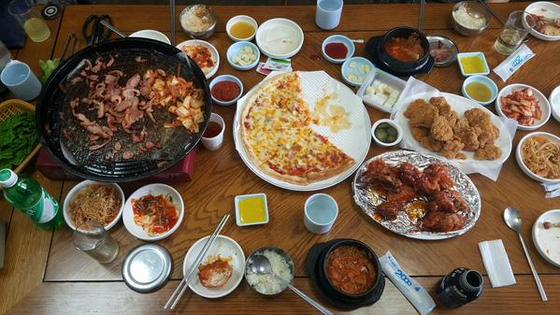 사진 속에는 구구데이 뜻에 맞게 치킨을 비롯해 피자와 각종 푸짐한 상차림이 눈에 띄었다.