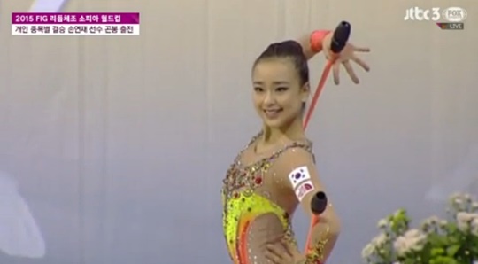 | ▲ '리듬체조 요정' 손연재 선수가 세계선수권대회 곤봉 예선에서 17.933점을 기록해 중간순위 2위를 달리고 있다./사진=JTBC 캡처 | ||