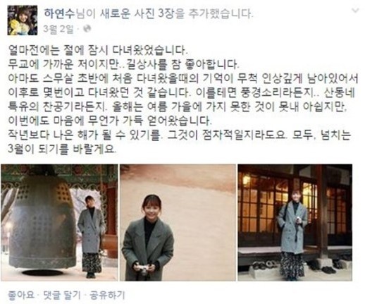 하연수는 지난 3월 2일 절에 다녀온 후 진지한 어투로 “무교에 가까운 저이지만, 길 상사를 참 좋아합니다. 무척 인상깊었다”는 말과 함께 인증샷을 남겼다.