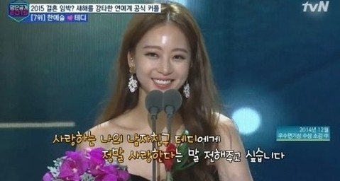 한예슬은 지난해 연말 시상식 ‘2014 SBS 연기대상’에 출연해 중편 드라마 부분 우수상을 차지했다. 한예슬은 수상 소감에 연인 테디를 언급해 눈길을 모았다.