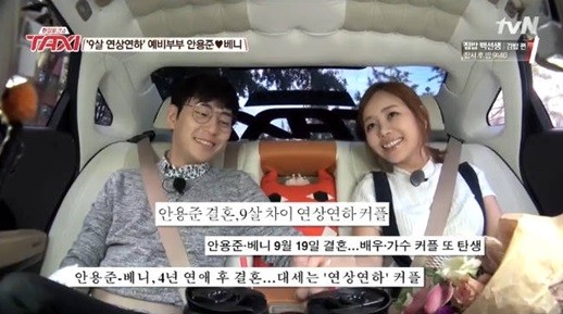 15일 오후 방송된 케이블채널 tvN '현장토크쇼 택시'(이하 '택시')에는 결혼을 앞둔 9살 연상연하 커플 배우 안용준과 가수 베니가 출연해 러브스토리를 공개했다.