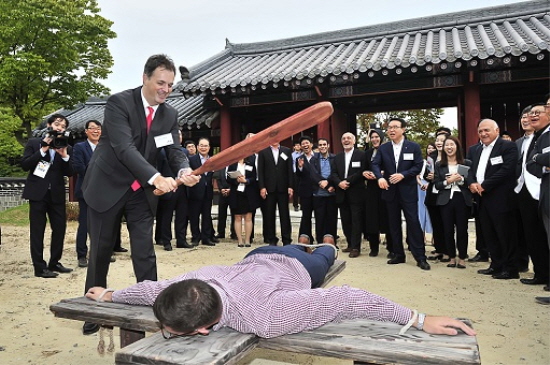 | ▲ "대장금 보고 싶니?"…용인 파크, 한류체험 테마파크로 재탄생. MBC 드라마 '대장금'을 촬영지를 찾은 처버 가보르 헝가리 대사가 포청에서 곤장치기 체험을 하고 있다. /사진=MBC 제공 | ||