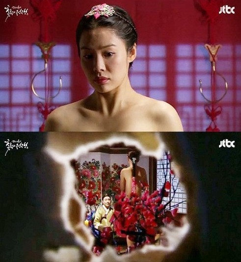 당시 김현주는 저고리와 치마를 모두 벗어 던지는 파격적인 노출 장면을 소화, 꽃으로 주요 부위를 가렸지만 뒤태가 적나라하게 공개돼 눈길을 끌었다.