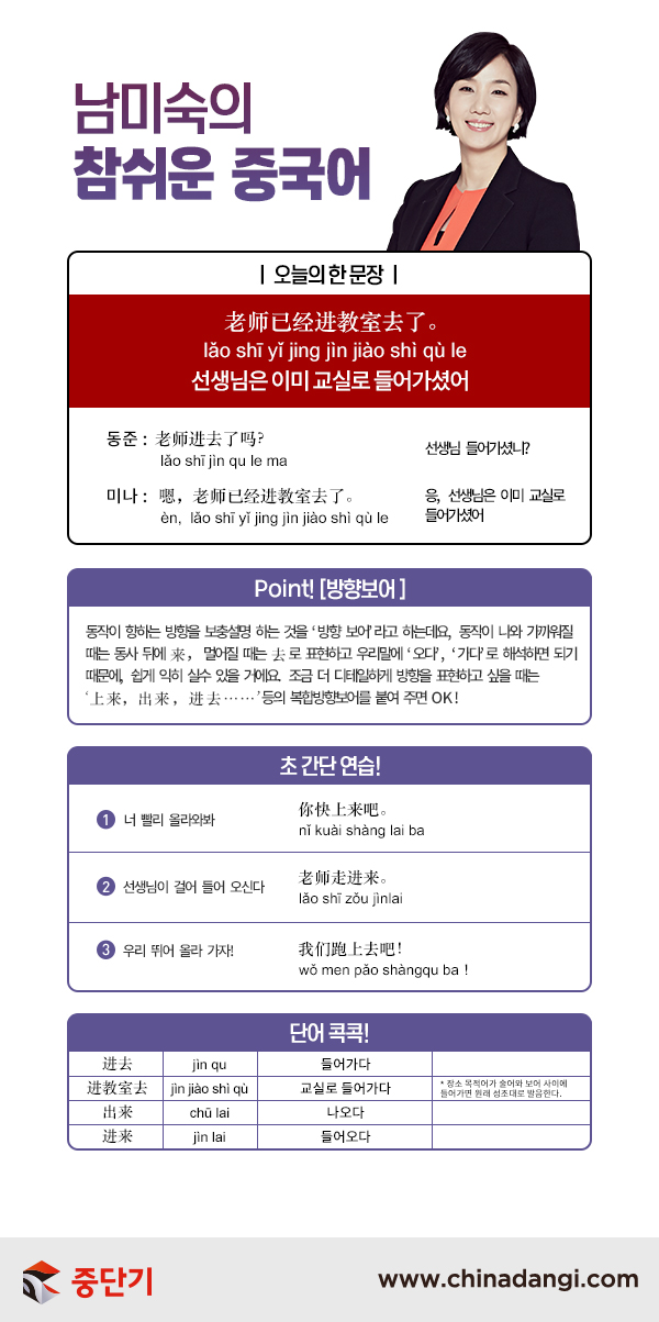 [남미숙의 참쉬운 중국어] 자세한 방향 표현 '복합방향보어' 붙이기
