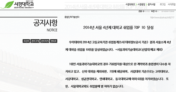 | ▲ 서경대학교가 지난해 9월부터 학교 홈페이지에 게재한 ‘2014년 서울 4년제 대학교 취업률 Top10 달성’ 공지글. 타 대학을 비하하며 취업률 순위를 조작한 서경대는 허위 사실 게재에 대한 취재가 진행되자 해당 글을 삭제했다. | ||