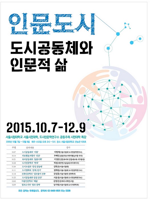 서울 동대문구 서울시립대 전농관에서 도시인문학연구소는 ‘인문 도시 – 도시공동체와 인문적 삶’을 주제로 한 도시인문학 특강을, 서울학연구소는 ‘서울의 남산과 남촌 이야기’ 서울학 특강을 선보일 예정이다.