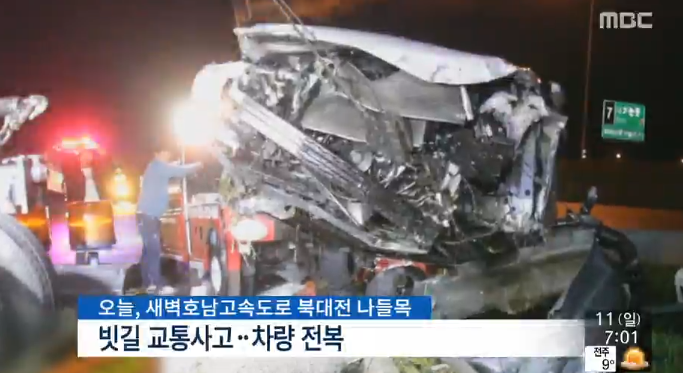 ▲ 경부고속로에서 11일 새벽 발생한 빗길 전복 사고. 정체에다 비가 내리면서 수도권 사나운 귀경길이 될 전망이다. 5시 최고 정체를 보일 수도권과 남부지방은 빗길 사고 다발이 우려되는 까닭에 안전 운전이 요구된다.