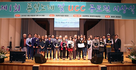 | ▲ 지난 16일 서울 동작구 숭실대에서 진행된 '제1회 통일노래 및 UCC공모전 시상식'에서 수상자 등이 기념사진을 촬영하고 있다. | ||